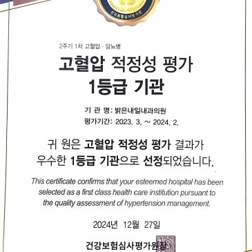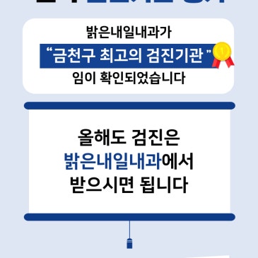 검진기관 평가는 보건복지부에서 국가건강검진의 질 향상과 검진 서비스에 대한 만족도를 높이기 위해 국가건강검진을 시행하는 병,의원을 대상으로 3년 주기로 평가하는 제도입니다. 밝은내일내과는 일반건강검진, 대장암검진, 간암검진, 자궁암검진에서 "우수" 등급을 획득하였으며, 유방암검진에서는 우수 등급을 넘어, "최우수" 등급을 획득하였습니다. 밝은내일내과는 4인의 내과전문의, 소화기내시경 인증의가 언제 오셔도 늘 편안하고 정확하게 검진 받으실 수 있도록 최선을 다하고 있습니다.